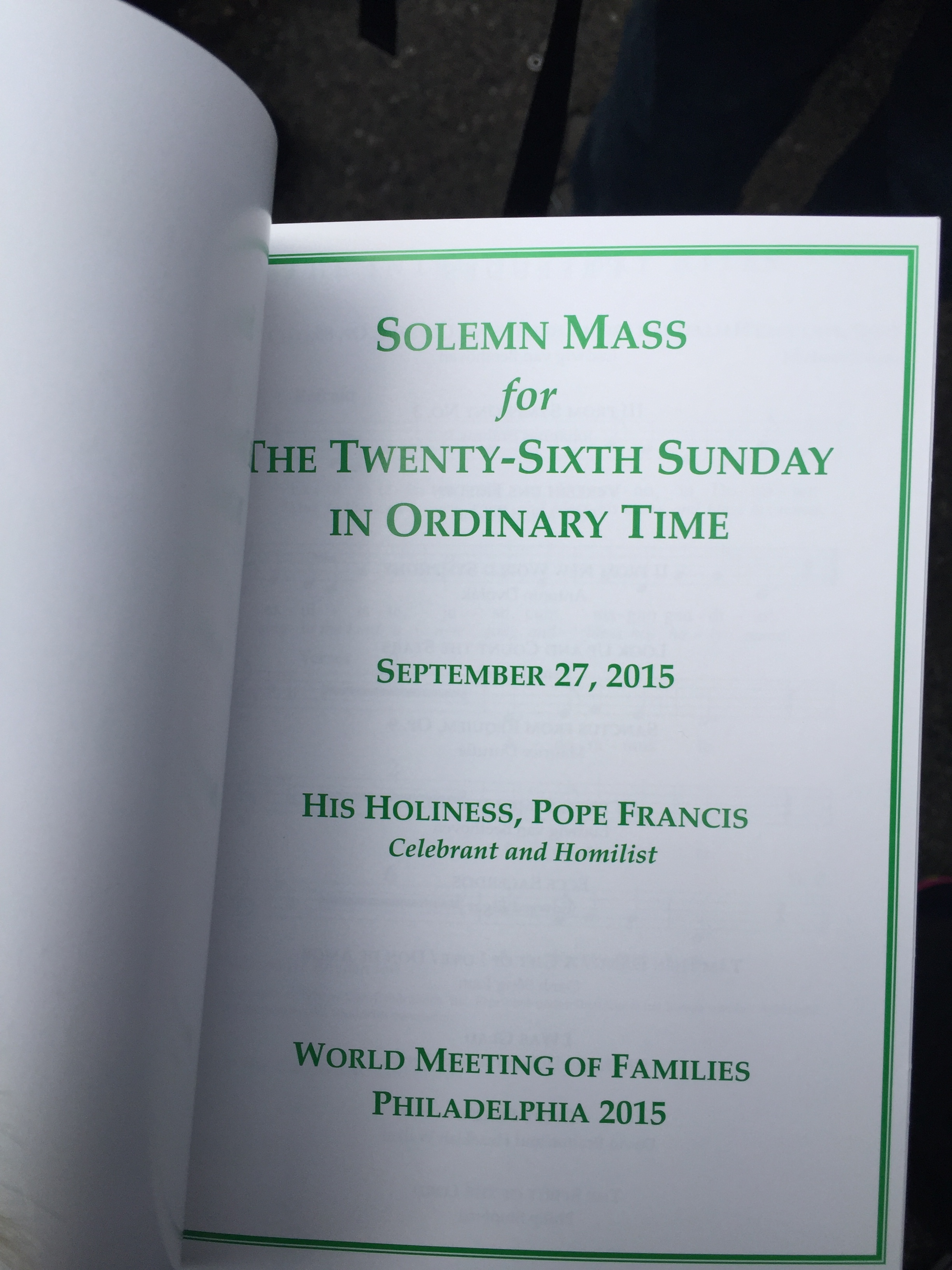 “Openness, attentiveness, and responsiveness are the essence of pilgrimage”, Cousineau writes. Over 2 million people joined me yesterday as we gathered to celebrate mass with Pope Francis. As I craddled my book on my backpack waiting to pass security, I heard dozens of languages spoken around me, some casually, some chanting, some in common prayer. Church groups donned in matching t-shirts attempted to stick together by holding hands. Babies cried and slept on shoulders, and in a vacant parking lot to the left of the security checkpoint, children ranging from 3 to 16 organized a soccer game. Souvenir sellers shouted their prices, and the crowd waxed and waned in anticipation and anxiety, in direct correlation to the amount of their personal space.